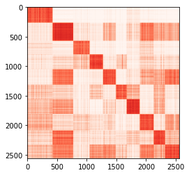 plt.imshow(np.log(otda.coupling_[_Ys.argsort(), :][:, _Yt.argsort()] + 1e-12), cmap='Reds')